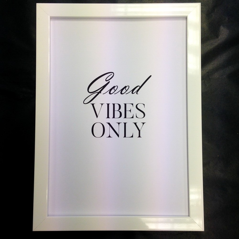 Good Vibes Only A4 printed frame. Glass front and a wooden backing with a white gloss plastic frame. These printed frames are a great addition to any room. Free standing or they can be fixed to a wall. Unique designs exclusive to us.