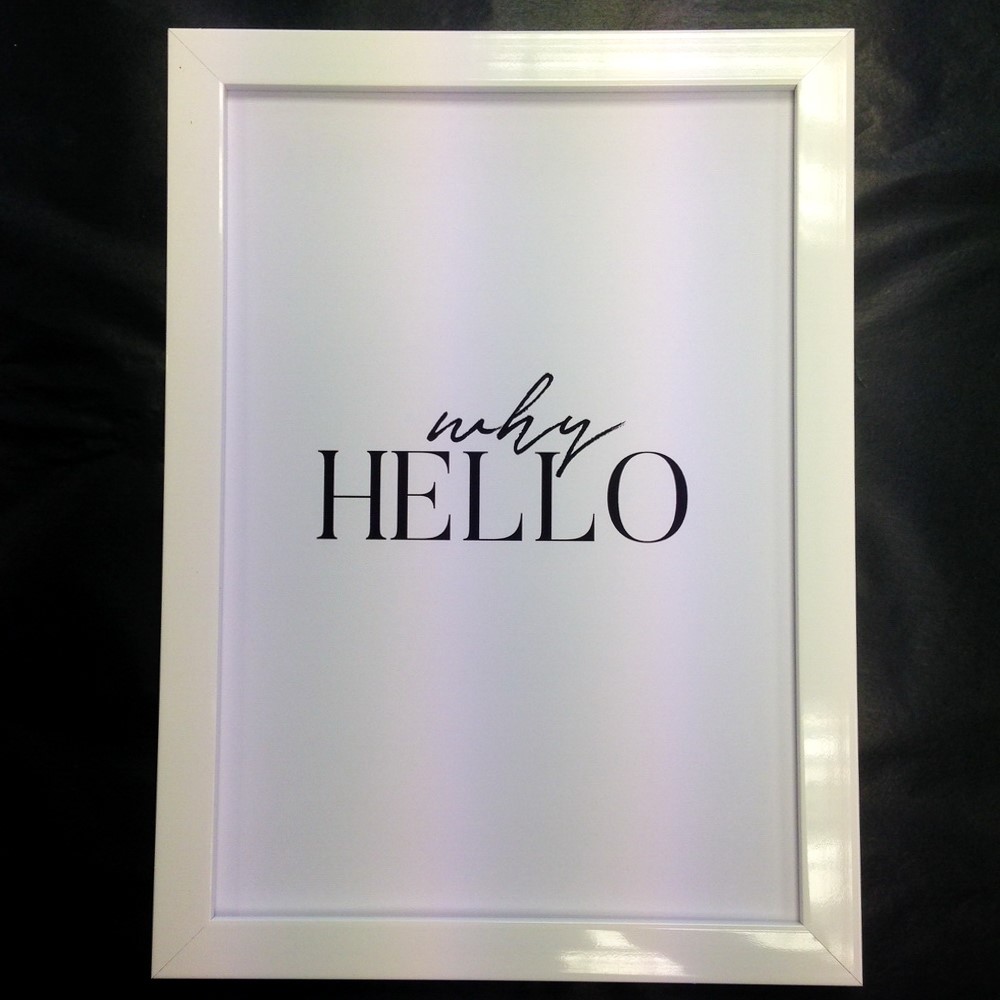 Why Hello A4 printed frame. Glass front and a wooden backing with a white gloss plastic frame. These printed frames are a great addition to any room. Free standing or they can be fixed to a wall. Unique designs exclusive to us.